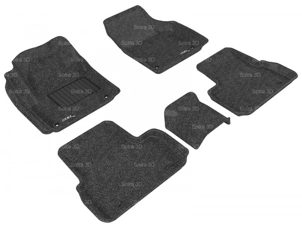 Коврики 3D Sotra предназначены для определённой модели автомобиля, имеют форму, повторяющую конфигурацию пола вашего автомобиля. Объёмная технология исполнения и комбинация ворсового покрытия с прорезиненной основой позволяет получить максимальный комфорт в салоне автомобиля одновременно с надёжной защитой от грязи и влаги. Прочный материал будет надёжно и долгое время защищать салон автомобиля от загрязнений. Нижний слой выполнен из противоскользящего покрытия MagicMat для предотвращения перемещения коврика по салону. Средний слой состоит из пористой резины. Создаёт долговечный и надёжный водонепро- ницаемый барьер. Эластичные свойства слоя снижают утомляемость ног водителя и пассажиров. Верхний слой выполнен из прочного и износоустойчивого материала ковроподобной структуры. Накладка на водительском коврике служит для увеличения срока службы. Высокий бортик эффективно удерживает грязь от проникновения в салон автомобиля. Коврики легко чистятся жёсткой щёткой. При сильном загрязнении можно использовать керхер. Высыхают за 2-3 часа. Водительский коврик имеет защитный кожух накрывающий площадку отдыха левой ноги. Задние коврики выполнены с перемычкой на тоннель.
