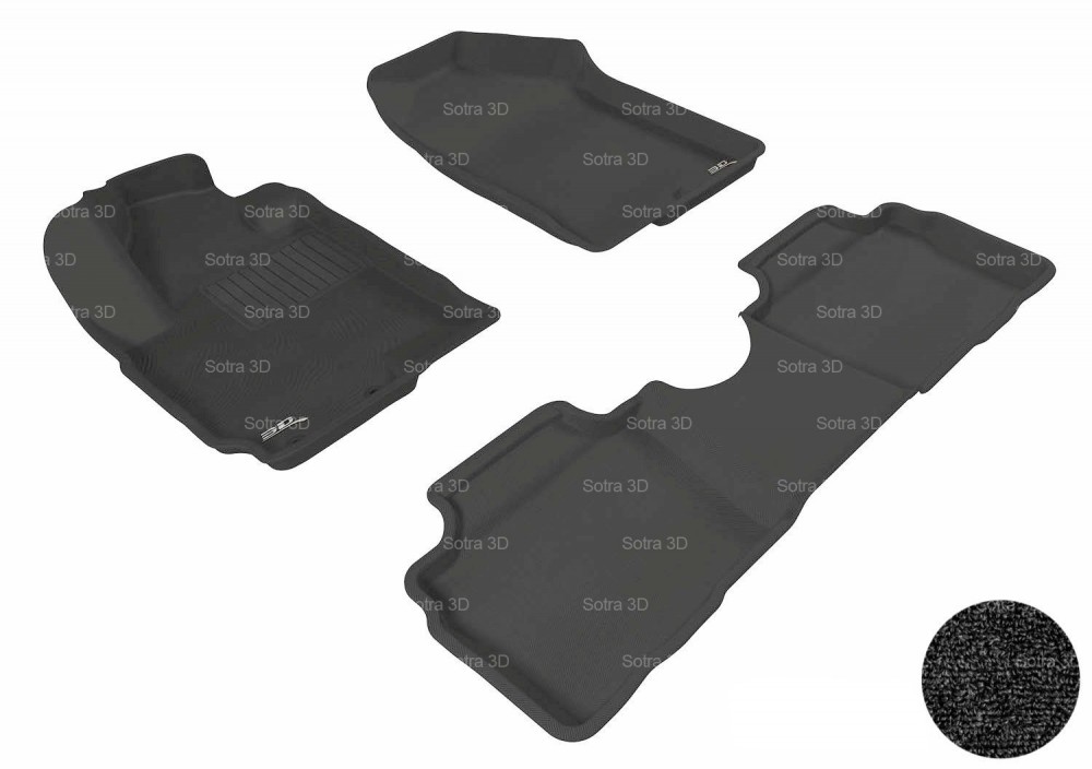 Коврики 3D Sotra предназначены для определённой модели автомобиля, имеют форму, повторяющую конфигурацию пола вашего автомобиля. Объёмная технология исполнения и комбинация ворсового покрытия с прорезиненной основой позволяет получить максимальный комфорт в салоне автомобиля одновременно с надёжной защитой от грязи и влаги. Прочный материал будет надёжно и долгое время защищать салон автомобиля от загрязнений. Нижний слой выполнен из противоскользящего покрытия MagicMat для предотвращения перемещения коврика по салону. Средний слой состоит из пористой резины. Создаёт долговечный и надёжный водонепро- ницаемый барьер. Эластичные свойства слоя снижают утомляемость ног водителя и пассажиров. Верхний слой выполнен из прочного и износоустойчивого материала ковроподобной структуры. Накладка на водительском коврике служит для увеличения срока службы. Высокий бортик эффективно удерживает грязь от проникновения в салон автомобиля. Коврики легко чистятся жёсткой щёткой. При сильном загрязнении можно использовать керхер. Высыхают за 2-3 часа. Водительский коврик имеет защитный кожух накрывающий площадку отдыха левой ноги. Задние коврики выполнены с перемычкой на тоннель.